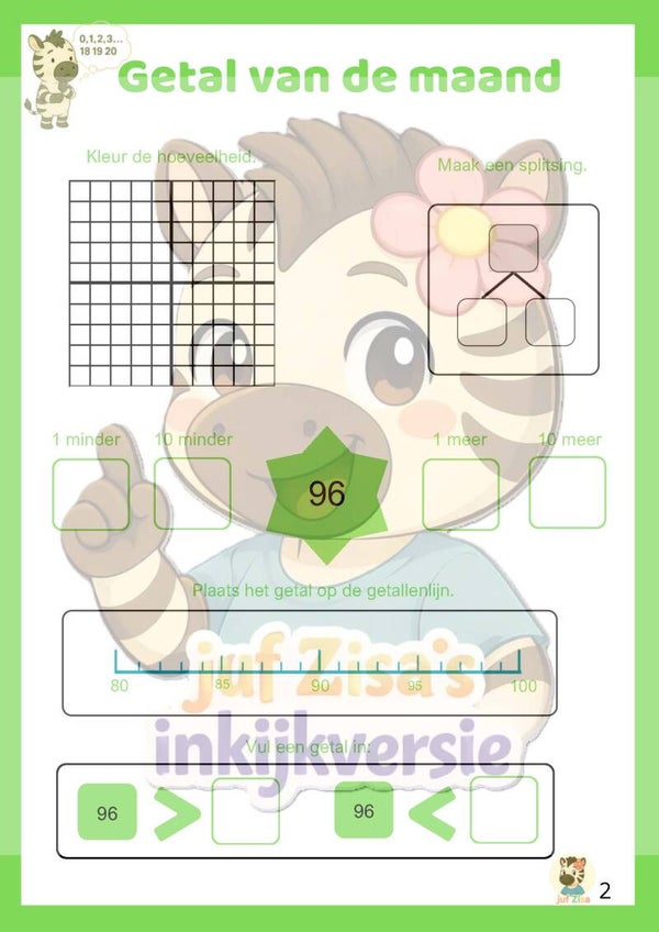 Getal van de maand: Uitgebreide getallenkennis tot 100 met het plaatsen van getallen op de getallenlijn (focus op getal 96).