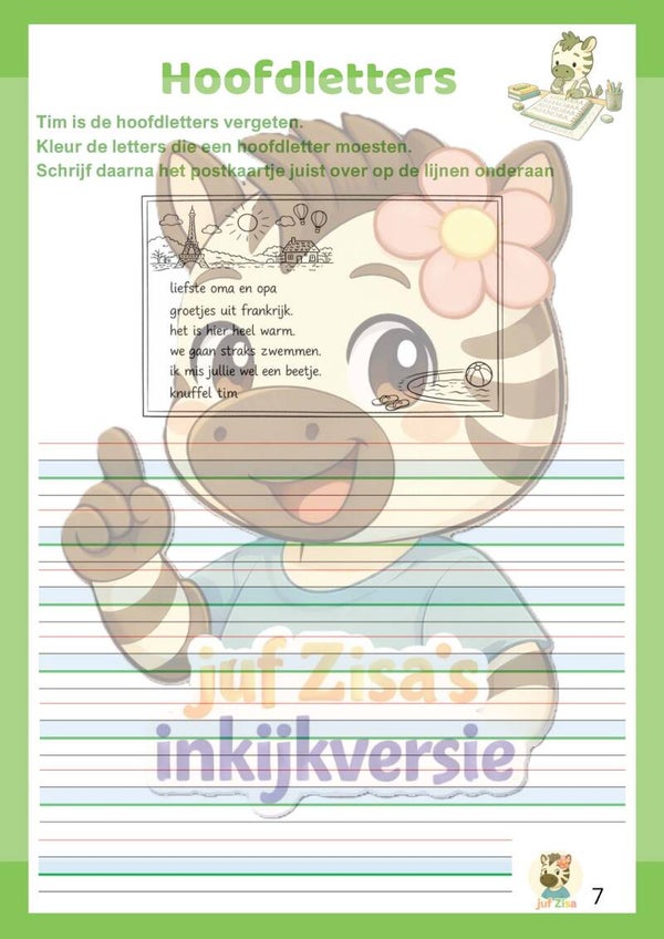 Schrijven: Ontbrekende hoofdletters toevoegen en een postkaartje correct overschrijven.